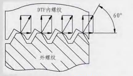 DTFLOCK螺母在內(nèi)螺紋的牙底處有一個(gè)30°的楔形斜面,當(dāng)螺栓、螺母擰緊時(shí),螺栓的牙尖就緊緊地頂在螺母的楔形斜面上,從而產(chǎn)生了很大的鎖緊力。由于牙形的角度改變,使施加在螺紋間接觸所產(chǎn)生的法向力與螺栓軸成60°角(見(jiàn)圖2),而不是像普通螺紋那樣的30°角,DTFLOCK螺紋法向壓力遠(yuǎn)遠(yuǎn)大于扣緊壓力,因此,所產(chǎn)生的防松摩擦力也就必然大大增加了。